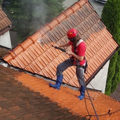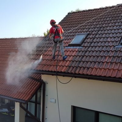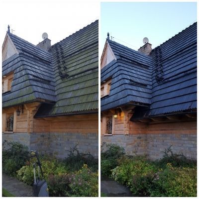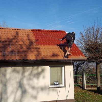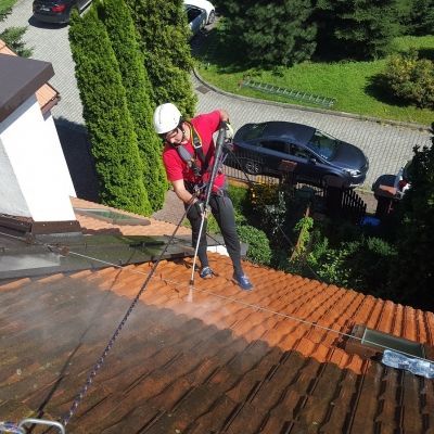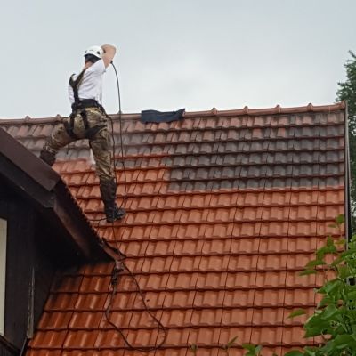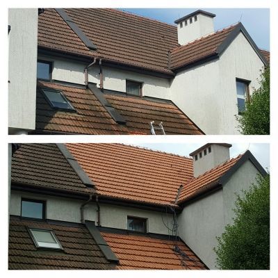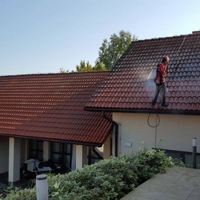 Dachy czyścimy maszynami wysokociśnieniowymi od 200 do 500 bar elektrycznymi lub spalinowymi. Zwracamy uwagę na wymagania klienta. Przed każdym czyszczeniem dachówka jest odtłuszczana ,po czym myta gorącą wodą. Gorąca woda zmniejsza napięcie powierzchniowe co daje lepszy i trwalszy efekt czyszczenia. Po wyczyszczeniu dachówkę spryskujemy preparatem zapobiegającym ponownemu powstawaniu mchów, porostów i zielonego osadu. Po czyszczeniu zaleca się zaimpregnować aby wzmocnić strukturę i przedłużyć trwałość na lata. Dachy czyści wykwalifikowany personel przy zachowaniu wszelkich środków bezpieczeństwa.